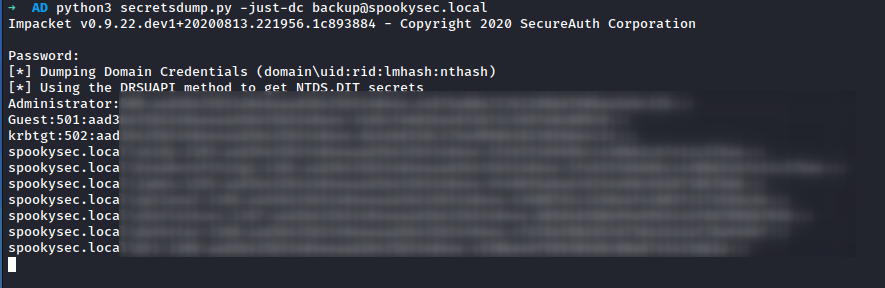 Now I have username and password, I decided to get Administrator’s hash with secretsdump.py, also from impacket