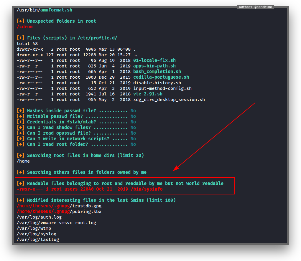 And linpeas was able to detect that /bin/sysinfo is label as RED