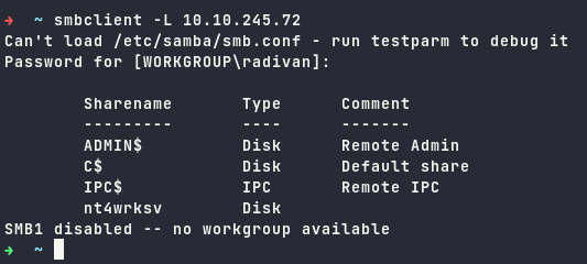 It shows the nt4wrksv share enabled, the next step is to connect with nt4wrksv and find out what we can get from it.