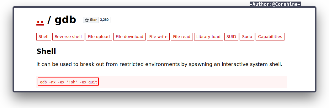 We check gtfobins to see how to escalate to another user with gdb.