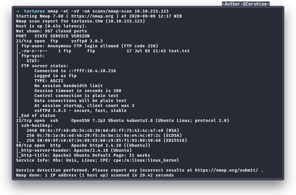 We found several ports are open, 21,22 and 80.