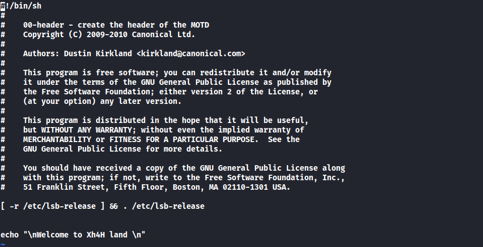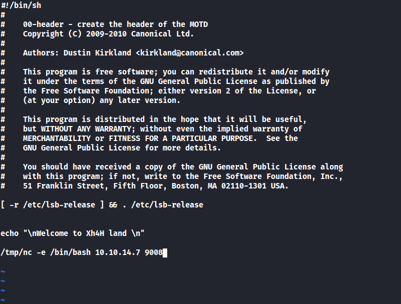 This is the default file from /etc/update-motd.d/ which I’m going to put my reverse shell inside the file and listen with netcat.
