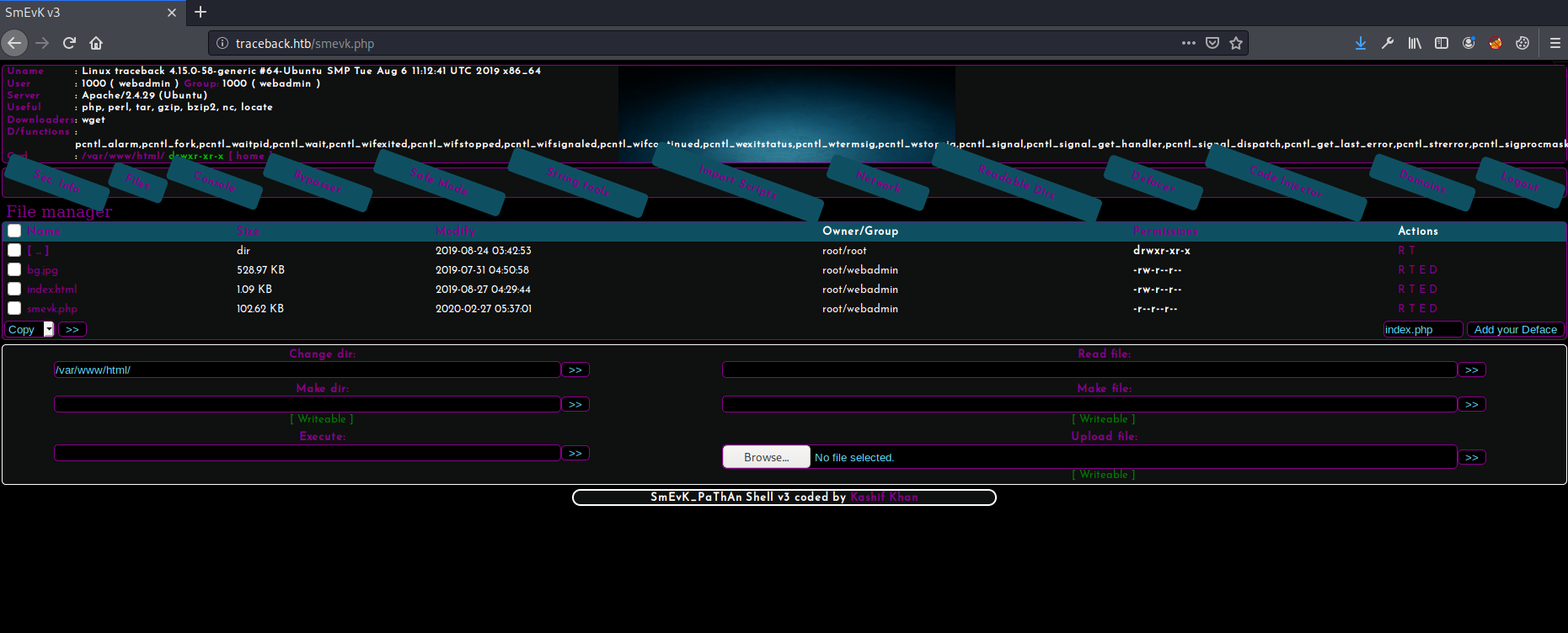 The smevk.php is able to execute command and see directory on the webpage itself.